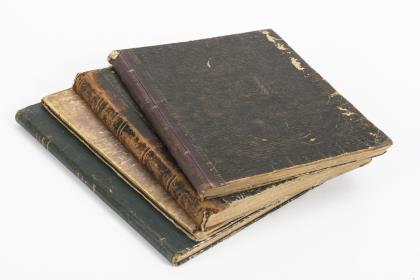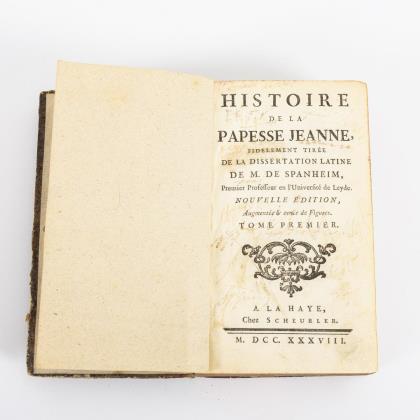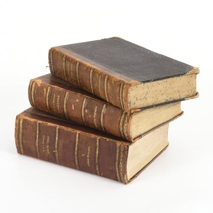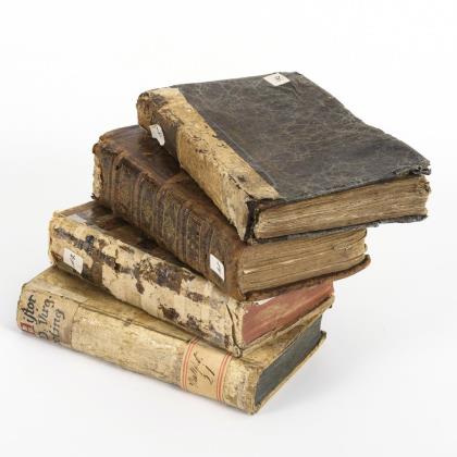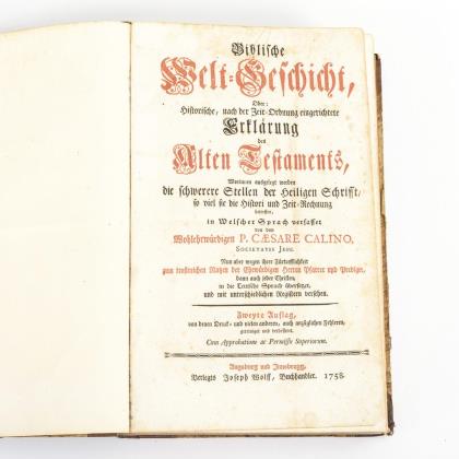 4 religiöse Schriften in einem Buch: "Trostreiche Erquick-Stunden, ... Perlen Der heiligen Jungfrau ...", München, gedruckt in der Churfürstlichen Buchdruckerey, 1757, 82 Seiten. / "... Perlen-Zierd ... in einer Heiligen Thecla ...", Mayntz 1755, 32 Seiten. / "Guldener Schlüssel ... Judam Thaddaeum ..." 1754, 102 Seiten. / "Marianische Novena ... Gnaden-Mutter Maria v. guten Rath" Brixen 1758, 44 Seiten. Halbledereinband. // Jacobo Irsing: "Historiae d. Virginis Oetinganae" Libri III. Monachii, Typis Haeredum Cornelii, Leyserii, 1643. 311, (8) Seiten, Pergamenteinband. / du Teil: "L'Histoire des Dovze Cesars Empereurs Romains, avec leurs Portraits", Lyon 1685, 510 Seiten, Ledereinband. / "Acta romanorum pontificum", 1560. 555, (118) Seiten, letzte Seiten fehlen, Pappeinband