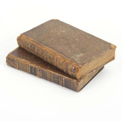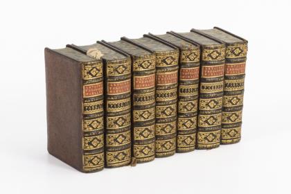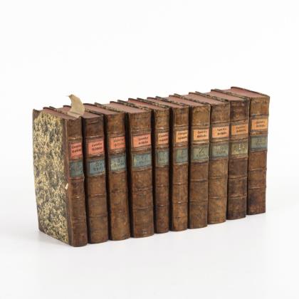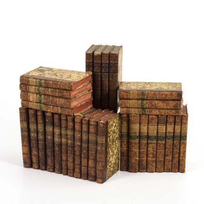 30 von 34 Bänden vorhanden. Themen und Bandnummern: Politique 1+2, Dictionnaire de Musique 1+2 (Genf 1785), Pieces diverses 1+2, Heloises 1-4, Confessions 1+2, Emile 1-4, Melanges 1-4, Traites sur la Musique 1, Theatre et Poesies 1, Memoires Band 3 und 4, Supplement 1-6. In zwei unterschiedlichen Halblederbindungen