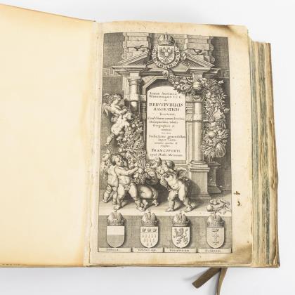 6 Teile in einem Band. Titelkupfer, (9), 516, (2), 141, 129 Seiten. In lateinischer Sprache, Beschreibung der Orte der Hanse. Im Pergamenteinband mit Resten von Lederschließen