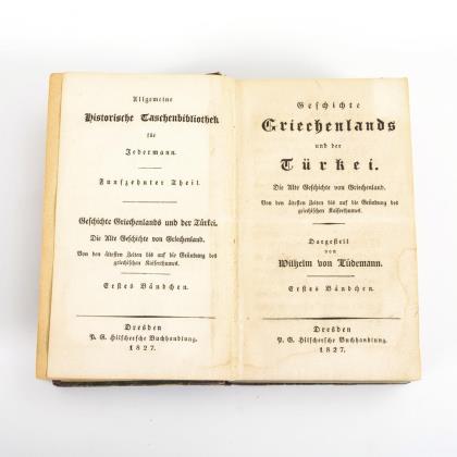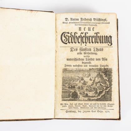 19. und 20. Theil in einem Buch. 19. Theil: "... Historie von Arabien von den Zeiten Mohammeds an enthält. ... darin das Leben Mohammeds historisch und critisch vorgetragen." Titelkupfer, Titelblatt, (44), 703 Seiten und 4 Abbildungen, vollständig. 20. Theil: Titelkupfer, Titelblatt, 30, 724 Seiten und 3 Abbildungen. // 20. Theil: (doppelt) "... welche die Begebenheiten der in diesem Theil fortgesetzten arabischen Geschichte, vom 96 bis 566sten Jahr der Heijra, oder 714 bis 1170sten Jahr der christlichen Zeitrechnung, enthalten." 30, 724 Seiten und 3 Tafeln. / 21. Theil: "Die Begebenheiten unter dem Khalifat ... von 566 bis 622sten Jahr der Hejra, oder Jahr Christi1171 - 1225. Algemeine Historie der Türken ... Algemeine Historie der Moguln und Tatarn, von der Zeit des Jenghiz Khan." Titelkupfer, Titel, 50, 664 Seiten und 3 Abbildungen bzw. Karte. / 23. Theil: "Algemeine Historie der Turkmanen und Uzbeken. Historie von Hindustan oder dem Reiche des grossen Mogul. Historie der ... Halbinsel Indiens". Titelkupfer, Titelblatt, 30, 678, (34), 2 Karten und 5 bildliche Vignetten