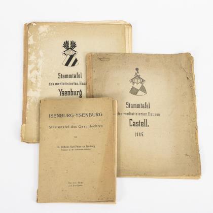 Wilhelm Karl Prinz von Isenburg: "Isenburg-Ysenburg - Stammtafel des Geschlechtes", Berlin 1941, ohne Seitenzahl. / "Stammtafel des mediatisierten Hauses Castell 1885", 6 großformatige Tafeln. / "Stammtafel des mediatisierten Hauses Ysenburg 1887", 18 großformatige Tafeln