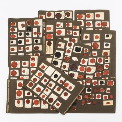 12 Albumkartons mit insgesamt 225 aufgebrachten älteren, zumeist roten Lacksiegelabdrucken mit Wappen adliger Familien, Kirchengemeinden, Amtssiegeln, Regimentssiegeln usw., zumeist auf Briefstücken, die von Hand beschriftet sind, z.B. v. Seckendorff, Graf v. Berchem, Graf v. Oettingen, Graf Bothmer, Ghzgl. Bad Linien-Inf.-Rgt., Ghzgl. Hess I. Inf.-Regt. usw