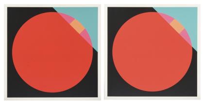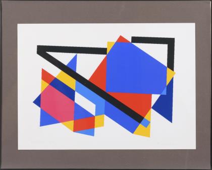 2x Eugenio Carmi: Komposition mit rotem Kreis, Blatt je: 42 x 42 cm, je Farbsiebdruck | Herbert Volz: "Die vier Farben des Kantenspektrums", Blatt: 23,5 x 19,8 cm, Exemplar: 5/100, Bleistiftsignatur, in originalem Schutzblatt | Oskar Dalvit: Vollständige Mappe mit 10 Tafeln nach Originalen des Künstlers und Begleittext, Mappe: 25,5 x 18,5 cm, in originalem Papp-Schutzumschlag, Marbach-Verlag Bern, Tafel 1: Original-Farbholzschnitt mit Bleistiftsignatur, Exemplar: 928/1000, datiert 1949; Umschlag mit Gebrauchsspuren