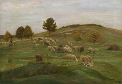 Der Hirte mit den Tieren auf einer hügeligen Weide unter bedecktem Himmel