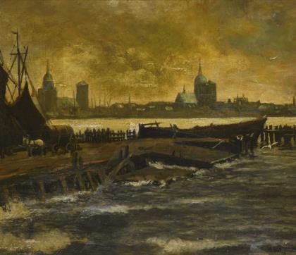 Blick über das Hafengelände zur Altstadt mit Nikolai- und Marienkirche