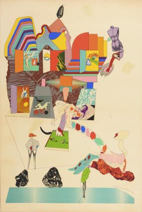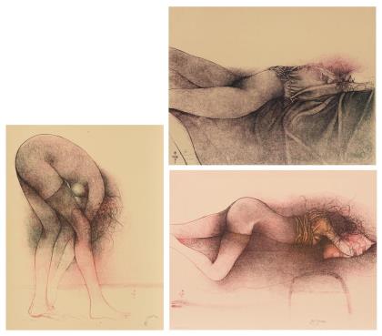 19 surrealistische Werke verschiedener Künstler, darunter 4 Radierungen von Gisela Breitling (1939 - 2008), 3 Lithografien von Peter Collien (*1938), 4 Lithografien von Werner Hilsing (*1938), 2 undeutlich signierte Farbradierungen mit surrealistischen Wesen, 1 Lithografie von Werner Pöschel (auch Petit Frère, 1927 -2002) und 4 weitere undeutlich signierte Werke