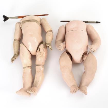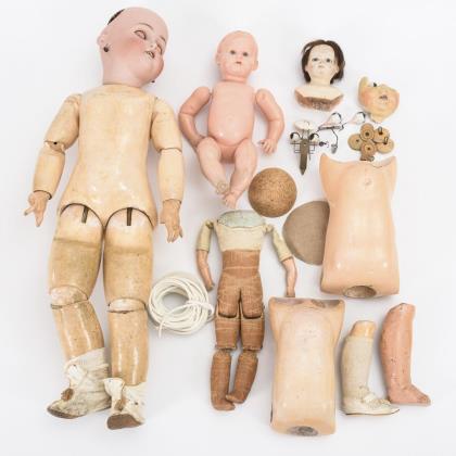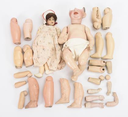 Zierliche Puppe mit defektem Kopf und neuem Gliederkörper. / Charakterbaby mit Kopffragment und Sitzbabykörper. / Dazu zahlreiche Puppenglieder aus Holz, Masse und Biskuit für den Puppendoktor