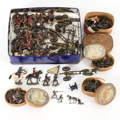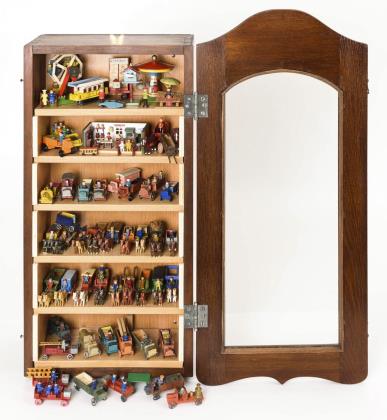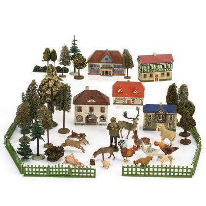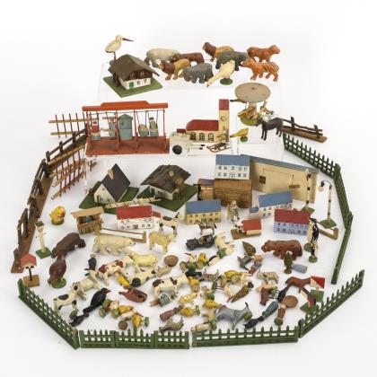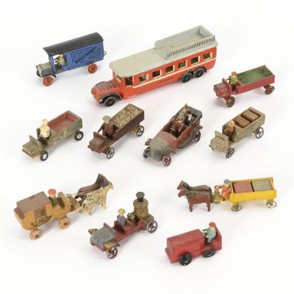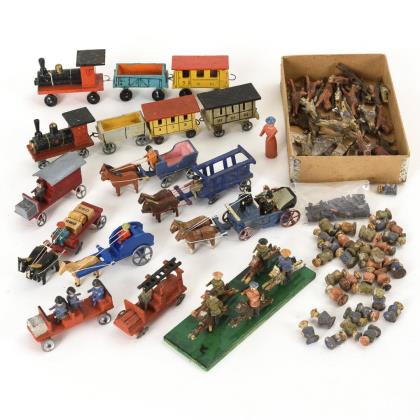 5 Gespanne (darunter Hochzeitskutsche), 2 Züge, 2 Feuerwehrautos, 1 Lastwagen, kleine Reiterei/Jagd. Als Zugabe Kästchen restaurierungsbedürftige Figuren (Pferdchen, Figurenrümpfe, lose Arme und Beine)