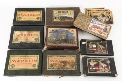 5 "Ergänzungskästen" Märklin: 1x 1a, 2x 2a, 2x 3a. / 2x "Walther's Metall-Baukasten Stabil" Nr. 49 und 50a. / 1x "Moteck" Metallbaukasten Nr. 1. / 1x "Merkus Elektrus". / 1x Holzbaukasten "Korbuly Matador". / Dazu einige Hefte