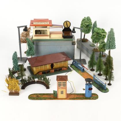 Gepäckabfertigung mit Waage, Güterschuppen, Schrankenwärterhäuschen mit Läutewerk, Schranke, 2 Lampen und zahlreiche Bäume