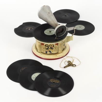 Trichter-Grammophon mit 7 Platten und 1 Schlüssel