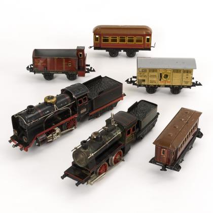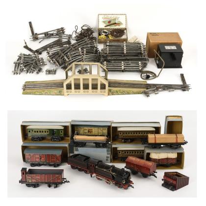 Spur 0. Lok "7104" mit Tender, 10 verschiedene Wagen und Schienen. Dazu Trafo, Brücke, 35 gerade Schienen, 24 gebogene Schienen, 3 Weichen und 15 kleine Verbindungen. Als Zugabe Zigarrenkiste mit Märklin-Glühbirnen und alten Kabeln