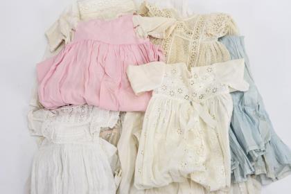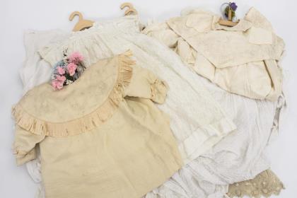 Verschiedene, meist weiße Kleidungsstücke, darunter Kleider und Blusen in Kindergröße. Anbei kleine Kunstblumensträußchen weiß, rosa und blau