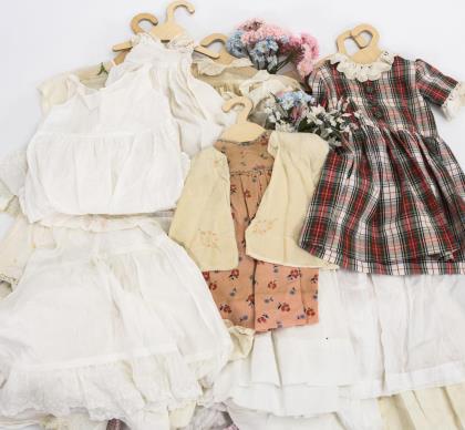 Ca. 25 Teile alte und 5 jüngere Kleidungsstücke für Puppen und Kinder. Darunter Kleider, Unterkleider, Blusen etc. Dazu verschiedene Kunstblumen in rosa, weiß und blau