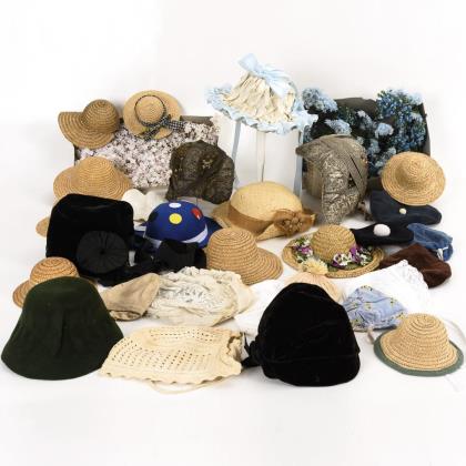 10 Strohhüte, 2x Filz, 14 Mützen und Hauben aus Stoff bzw. Strickwaren. 2 alte Trachtenhauben mit Metallfadenborten. Als Zugabe 2 Kartons mit weißen, hell- und mittelblauen Sträußchen aus Stoff und Draht
