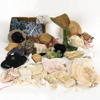 10 Hüte aus Stroh, Stoff und 1x Filz. 16 Stoffhauben, teils mit Spitzenbesatz. Als Zugabe 1 Kleinkindermuff sowie ca. 50 hell- bzw. mittelblaue Stoffblumensträußchen
