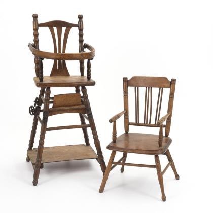 Umklappbarer Hochstuhl mit Tischchen und Rädern. / Kleiner Armlehnstuhl