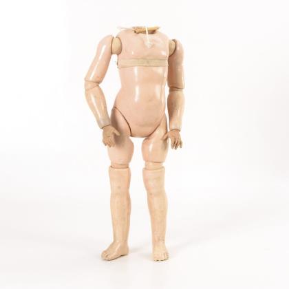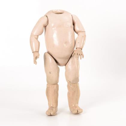 Kurbelkopf, feste blaue Glasaugen, anmodellierte Zahnreihe. 13-teiliger Gliederkörper. Ohne Perücke und Kleidung