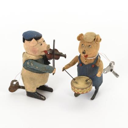 Schweinchen als Trommler (980/1) und Schweinchen als Violinspieler (980/2). Beide mit intaktem Werk und Schlüssel