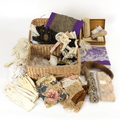 Zahlreiche Borten und Bänder, darunter Brokat- und Häkelspitze, sowie einige Paare weiße Lederhandschuhe. In Korbkoffer und Holzdose