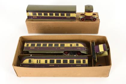 <strong></strong>Spur 0. Violett-gelbe Lackierung. 2 Triebwagen und dazugehöriges Mittelstück bzw. Verbindungsteil für Ausbau in 3-teiligen Zug. In 2 Originalkartons