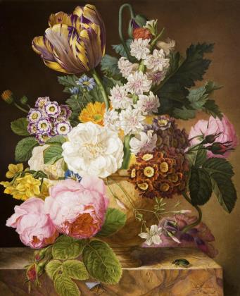 Balustervase mit zwei Maskaronhandhaben, Ornamental- und Floralrelief sowie Knaufdeckel. Schauseitig ein großes Blumenbukett mit Distelblüten und Narzissen