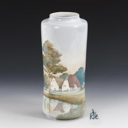 1x KPM Berlin, Entwurf von Trude Petri (1906-1998): halbovoide Vase (H 15 cm). / 2x Metzler & Ortloff: Flötenvasen mit Blumenmalerei und einem Entenpaar (H 10,5 cm). / 1x Rosenthal: halbovoide Vase mit zwei Henkeln (H 10 cm)
