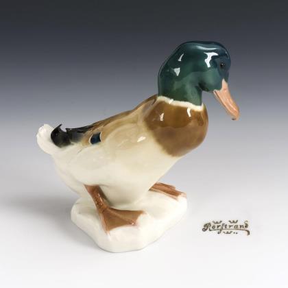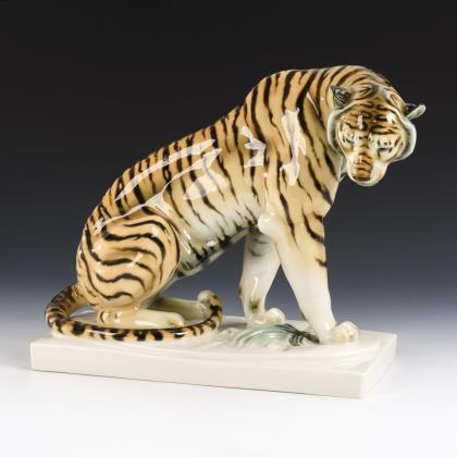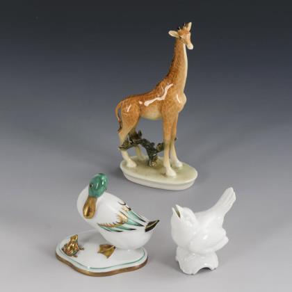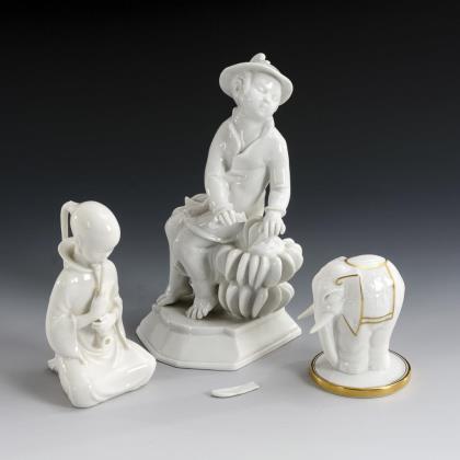 1x Aelteste Volkstedter, Neuausformung eines Modells der Schwarzburger Werkstätten, Modell-Nr. U 525, Entwurf von Marta Schlameus 1925: sitzender Japaner mit Bananenstaude und Messer (H 21 cm). / 1x Royal Copenhagen, Modell-Nr. 2342, Entwurf von Arno Malinowski 1920er Jahre: sitzendes Mädchen mit Opiumpfeife (H 13,5 cm). / 1x Krautheim: Elefant mit Decke (H 9 cm)
