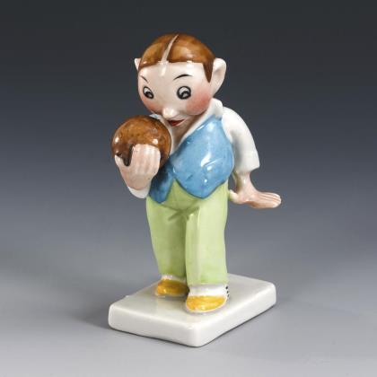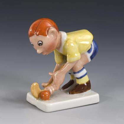 Auf einer kleinen Rechteckplinthe stehender Knabe mit Kugel