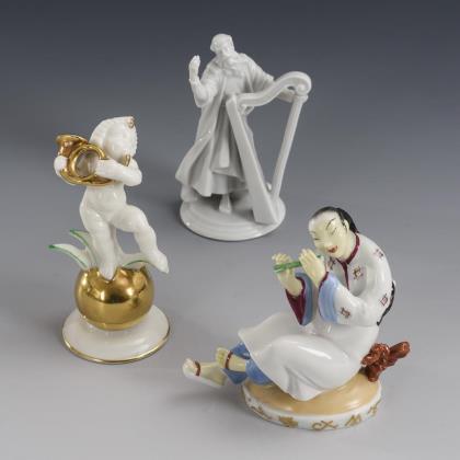 1x gemarkt Rosenthal 1948, Modell-Nr. K 837: bärtiger Mann mit Harfe. / 1x gemarkt Hutschenreuther, 1918-1938: auf einer goldenen Kugel stehender, ein Waldhorn spielender Putto. / 1x gemarkt Augarten, um 1930: sitzender, eine Flöte spielender Chinese