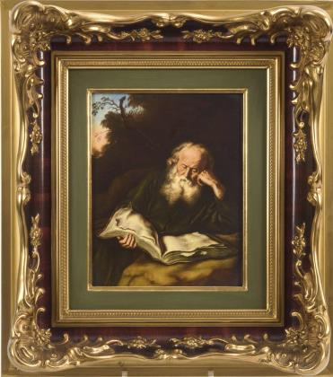 Im Wiener Stil gestalteter Teller mit prunkvoller ornamentaler Goldreliefmalerei auf der kobaltblauen Fahne. Im Spiegel die Darstellung eines lesenden Mönches, unterseitig bezeichnet "Der Eremit". Detail aus dem gleichnamigen Gemälde von Carles Landseer (1799-1879)