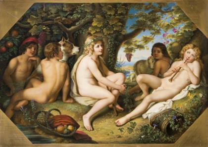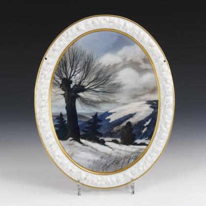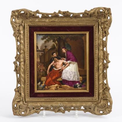 Feine farbige Bemalung nach der Gemälde-Vorlage von Julius Hübner (1806 Oels - 1882 Dresden). Das Gemälde hing in der Gemäldegalerie Neue Meister in Dresden. War seit 1945 als Kriegsverlust verzeichnet, wurde 2009 im Kunstmuseum Simferopol wiederentdeckt. Unsigniert. Goldfond in den Ecken, am oberen und unteren Rand. Unglasierter Boden, Pressmarke, Ritzmarke. Profilierter Waschgoldrahmen