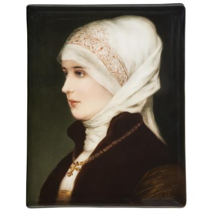 Rechteckige Platte mit dem Porträt einer sitzenden Dame mit rotem Umhang, nach einem Gemälde des italienischen Malers Palma il Vecchio (um 1480 - 1528)