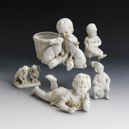 Liegendes Mädchen (L 21 cm) und an einem Korb sitzender Knabe mit zwei Hasen (H 13,5 cm). / Dackelpaar (H 7,5 cm), Knabe mit Puppe (H 10,5 cm) und Knabe, auf einem Nachttopf sitzend (H 11 cm)