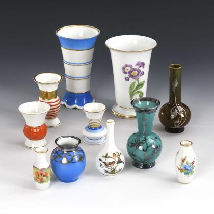 Verschiedene Vasen (u.a. Meissen, Rosenthal, Herend). Verschieden dekoriert (darunter 3x mit Silberoverlay, 1x Blumenmalerei, 2x Blumendekor), 1x Keramik