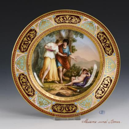 Teller mit prunkvoll gestalteter Fahne mit rosa, bordeauxfarbenem, türkisem und hellblauem Teilfond mit ornamentaler Goldreliefmalerei und weißen Emailpünktchen, im Spiegel eine mythologische Darstellung mit einem jungen Paar, den schlafenden Amorknaben überraschend, unterseitig die Bezeichnung "Mione und Amor"