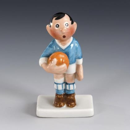 Auf einer kleinen Rechteckplinthe stehender Knabe mit Ball