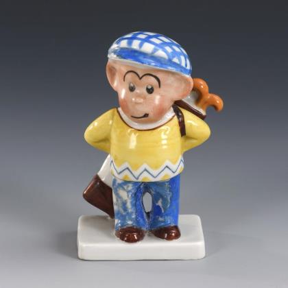1x Sitzendorf: an einem Korb mit Kugeln sitzender, im Stil des Art déco bemalter Chinese (H 14 cm). / 1x Goebel: Art-déco-Figur einer tanzenden Chinesin (H 16 cm). / 1x ungemarkt: kleine Figur eines Pierrots mit Blumenstrauß (H 11,5 cm)