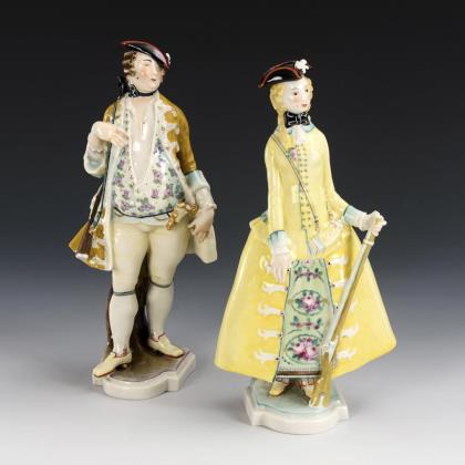 Stehende Figuren eines Jägers und einer Jägerin in Rokokokleidung, jeweils mit einer Flinte