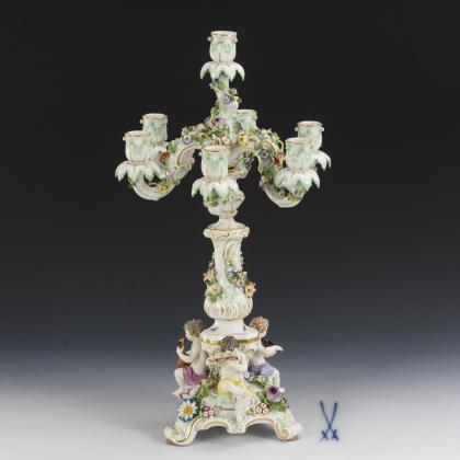 7-flammiger Leuchter mit blütenbelegten Leuchterarmen, Rocailleschaft sowie drei, auf einem blütenbelegten Sockel sitzenden, musizierenden Putten