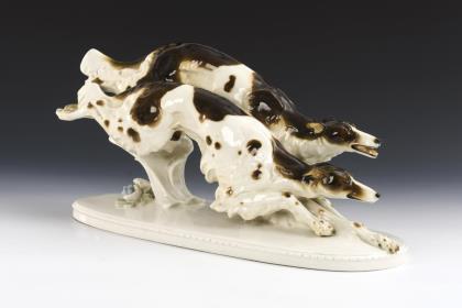 Über einen Ovalsockel jagendes Windhundpaar