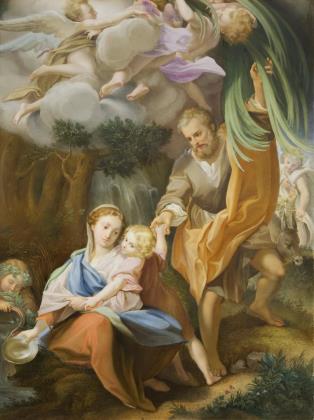 Feine farbige Bemalung nach der Gemälde-Vorlage von Antonio da Correggio (Antonio Allegri, 1489 Correggio - 1534 Correggio). Das Gemälde (217 x 137 cm) hängt in der Galleria nazionale di Parma. Es wurde für die Kirche San Sepolcro in Parma gefertig. Das Bild ist auf einer diagonalen Linie aufgebaut, die links unten mit der Schale beginnt und durch die Hände der Jungfrau, dem Jesuskind und von Josef nach oben verläuft, die Pose Jesu fungiert als Bindeglied. Unsigniert, unglasierter Boden, Pressmarken mit Jahreszahl, Ritzmarke, Bindenschild. Profilierter Goldrahmen mit schwarzer Ornamentleiste