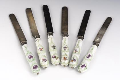 Im barocken Stil gestaltete Messer mit rocaillereliefierten Griffen mit Blumenmalerei, Metallklingen