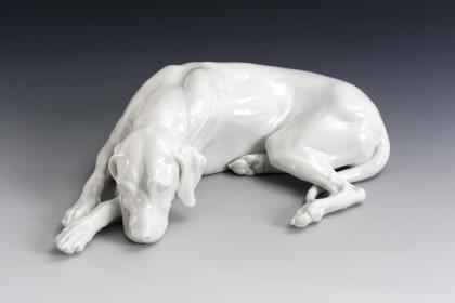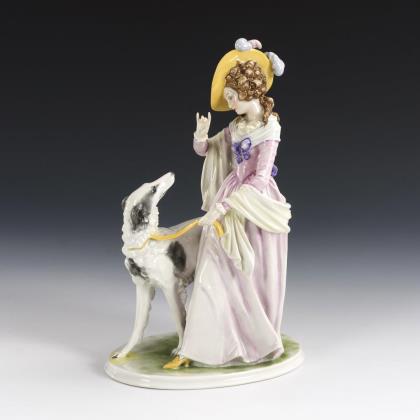 Plastik einer vornehmen Rokokodame, einen Barsoi an der Leine führend