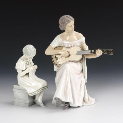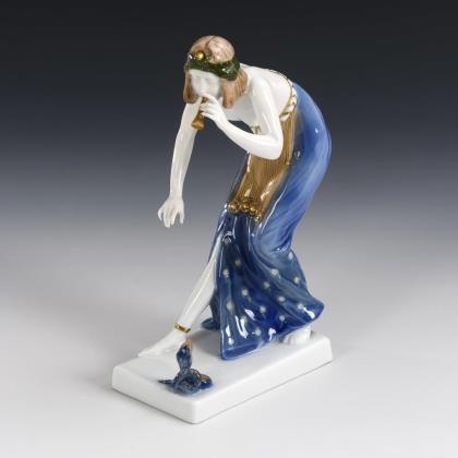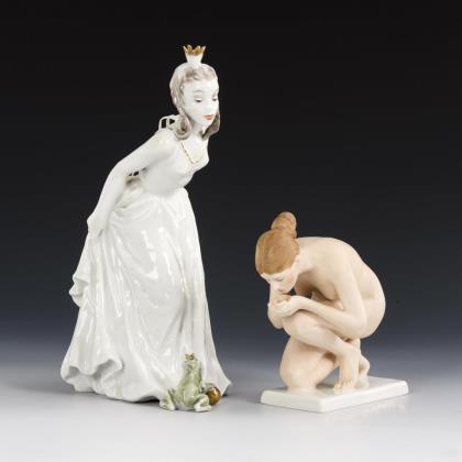 1x Froschkönigin, Modell-Nr. 1793/2, Entwurf von Lore Friedrich-Gronau, 1948: Plastik einer Prinzessin mit kleiner Krone, zu ihren Füßen ein Frosch mit goldener Kugel und Krone sitzend (H 27,5 cm). / 1x Trinkende, Modell-Nr. 752/1, Entwurf von Ernst Wenck, 1924: auf einer Rechteckplinthe kniende, aus ihren Händen trinkende, nackte junge Frau, Biskuitporzellan (H 15 cm)