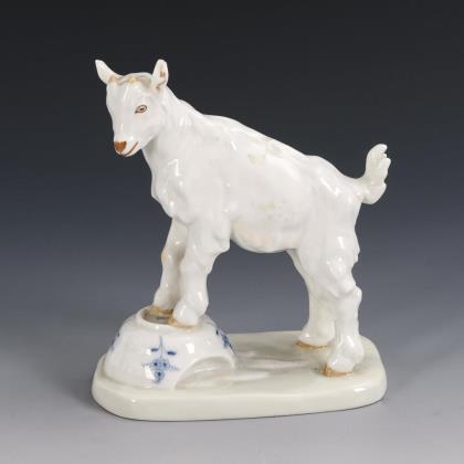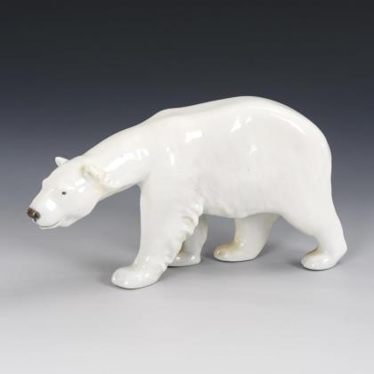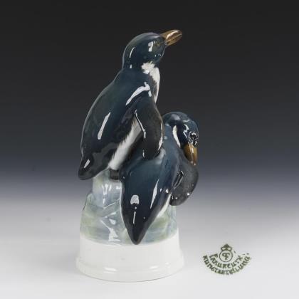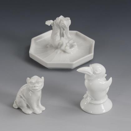 1x Krokodil in oktogonaler Schale, Modell-Nr. 36, Entwurf von Karl Himmelstoss, bezeichnet. / 1x Pinguin, Modell-Nr. 918, Entwurf von Hans Küster, bezeichnet. / 1x Fohund, Modell-Nr. 69