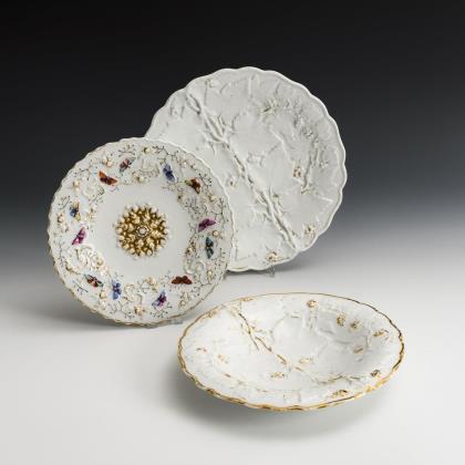 Teller und Schale mit Weinrebenrelief. / Teller mit Schmetterlings- und Floralrelief