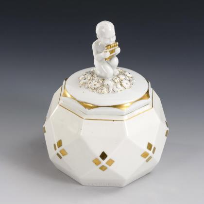 1x hohe konische Dose mit gerade godronierter Wandung und zwei kleinen Handhaben, auf dem Deckel ein Putto mit Äpfeln sitzend (H 29 cm). / 1x Kraterkorpus mit kannelierter Wandung und schwarz-goldenen Blumenbuketts, auf dem Deckel ein Zicklein als Knauf (H 23,5 cm)