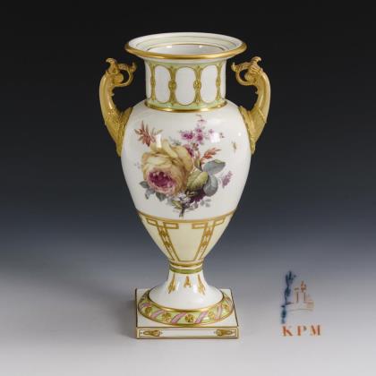 Ovoide Vase mit zwei goldbronzierten Rosetten- und Blatthenkeln, Kraterhals, Rundfuß, auf Quadratplinthe. Hellgrüner und beigefarbener Teilfond mit Goldreliefmalerei, beidseitig ein fein gemaltes Blumenbukett