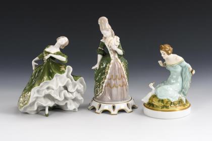 1x junge Frau mit Gans (= "2 Prinzessinnen"), Modell-Nr. 537. / 1x Rokokotänzerin, Modell-Nr. K 207. / 1x Rokokodame mit Fächer ("Finale"), Modell-Nr. K 203